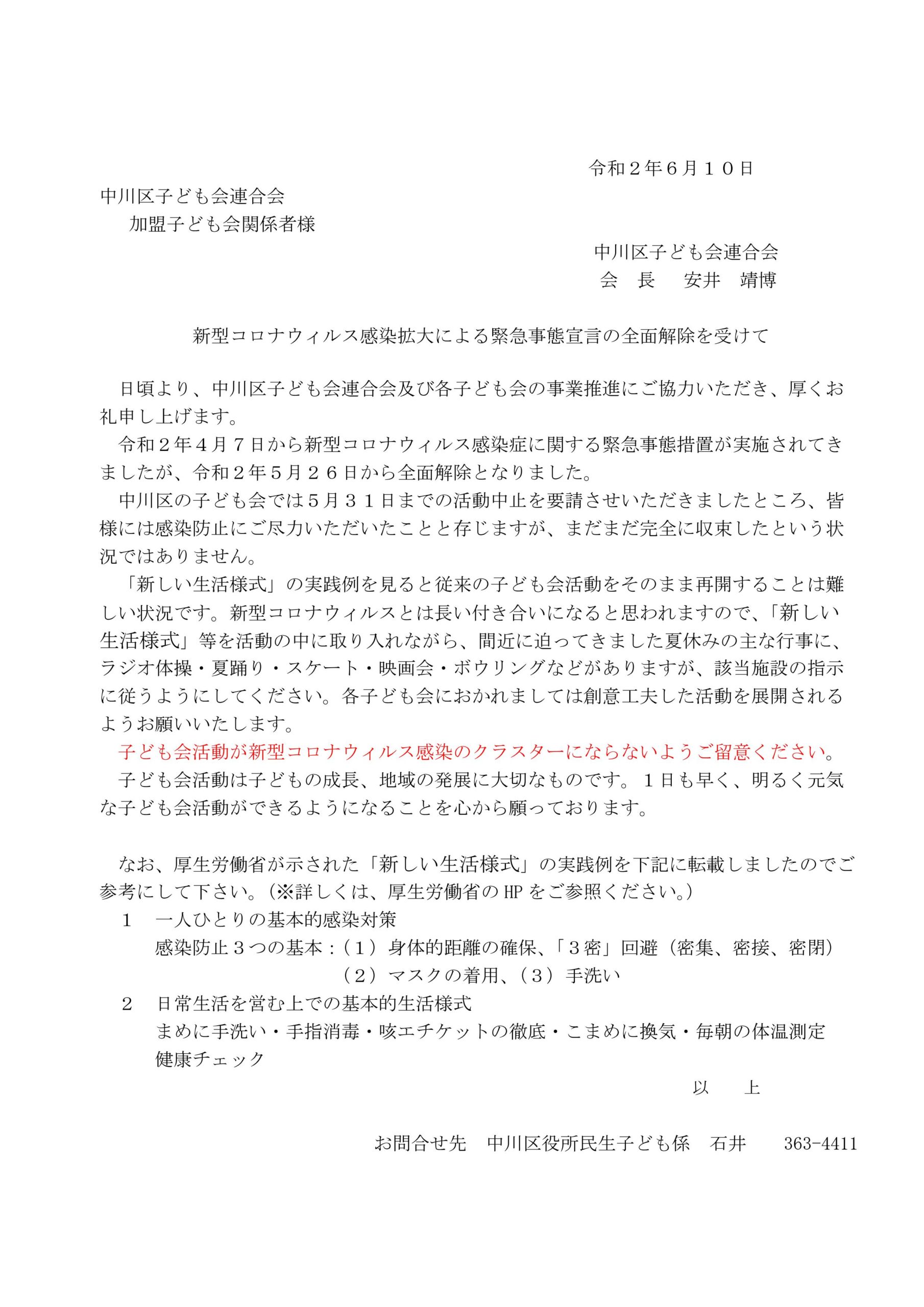 みなさん大変疲れ様です。新型コロナウイルス感染症予防対策に伴う子ども会活動について中川区子ども会連合会からのお知らせです。