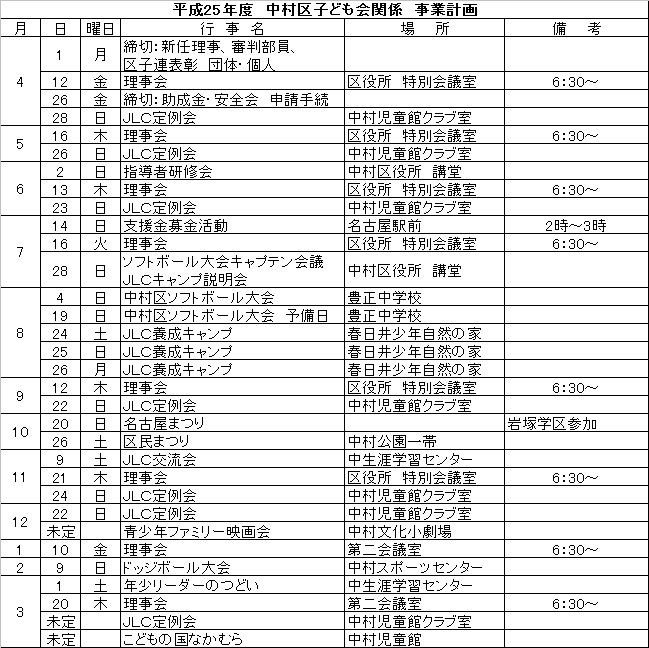 イベント・事業計画 Tweet 平成25年度中村区子ども会事業計画予定表です。行事の詳細は、イベントカレンダーをご覧下さい。また、日にちが近づきましたら各理事の方から説明があると思います。 たくさんの子どもたちの参加をお待ちしてます。 ページ: 1 2 3 4 5